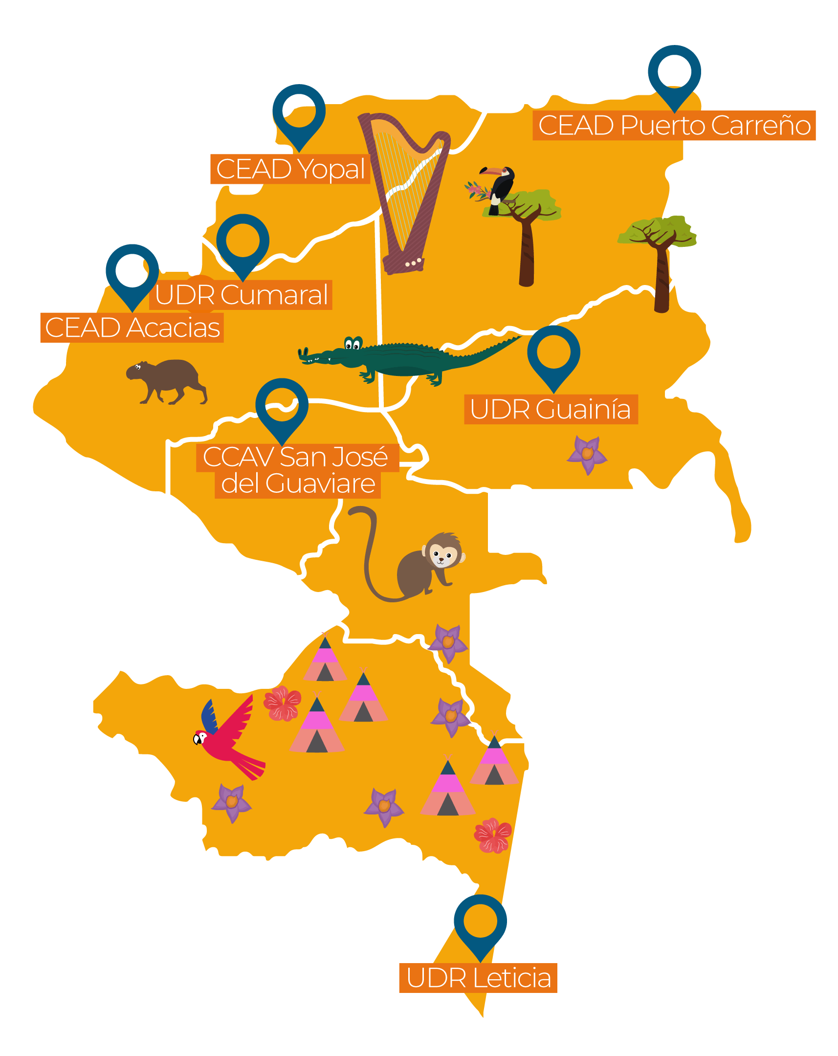 En medio de las tierras selváticas, la majestuosidad de la llanura y la enorme diversidad de su gente, la Zona Amazonia Orinoquia ofrece atención educativa desde 1986, y actualmente posee 7 centros ubicados en Puerto Inírida, San José del Guaviare, Leticia, Puerto Carreño, Yopal, Cumaral y Acacías.
